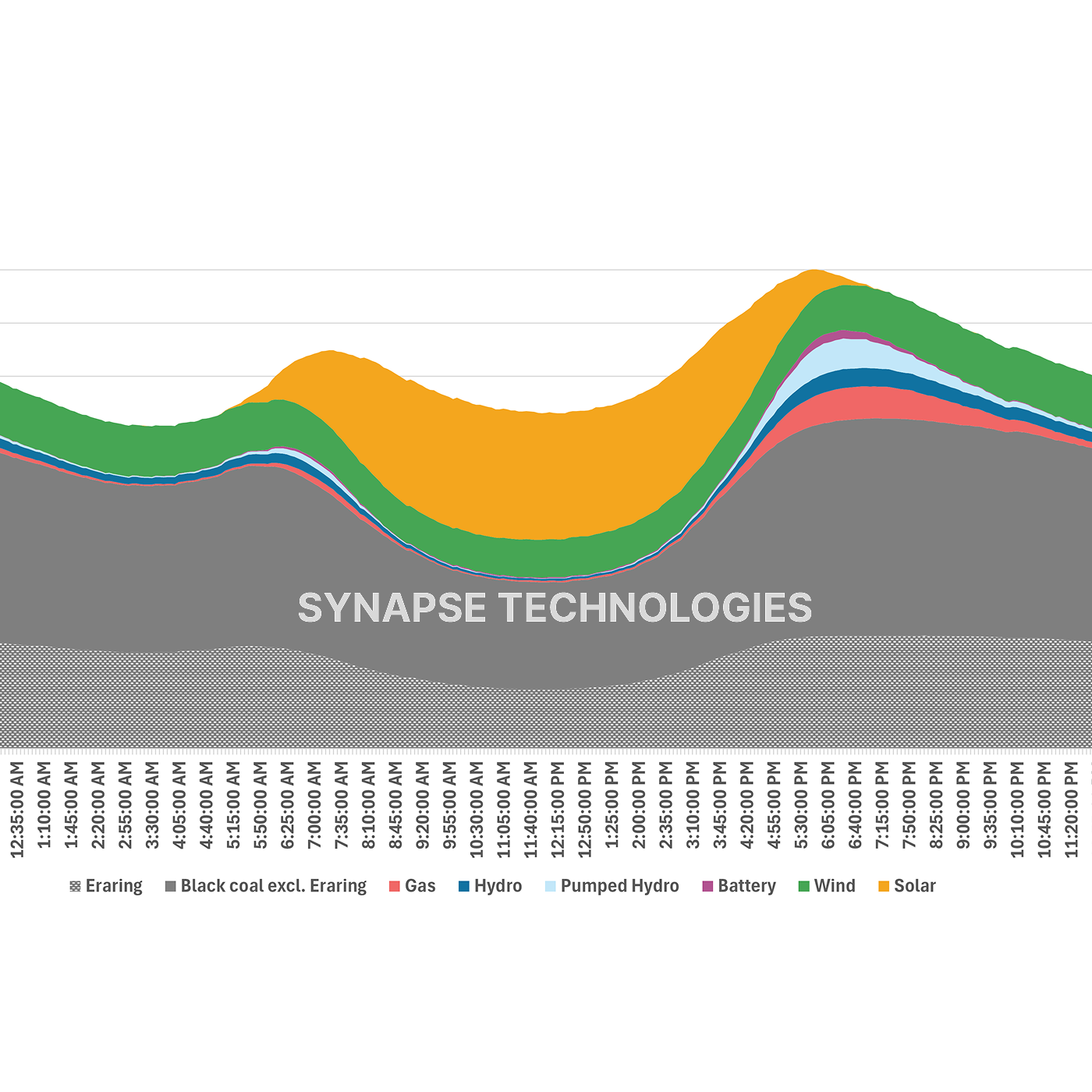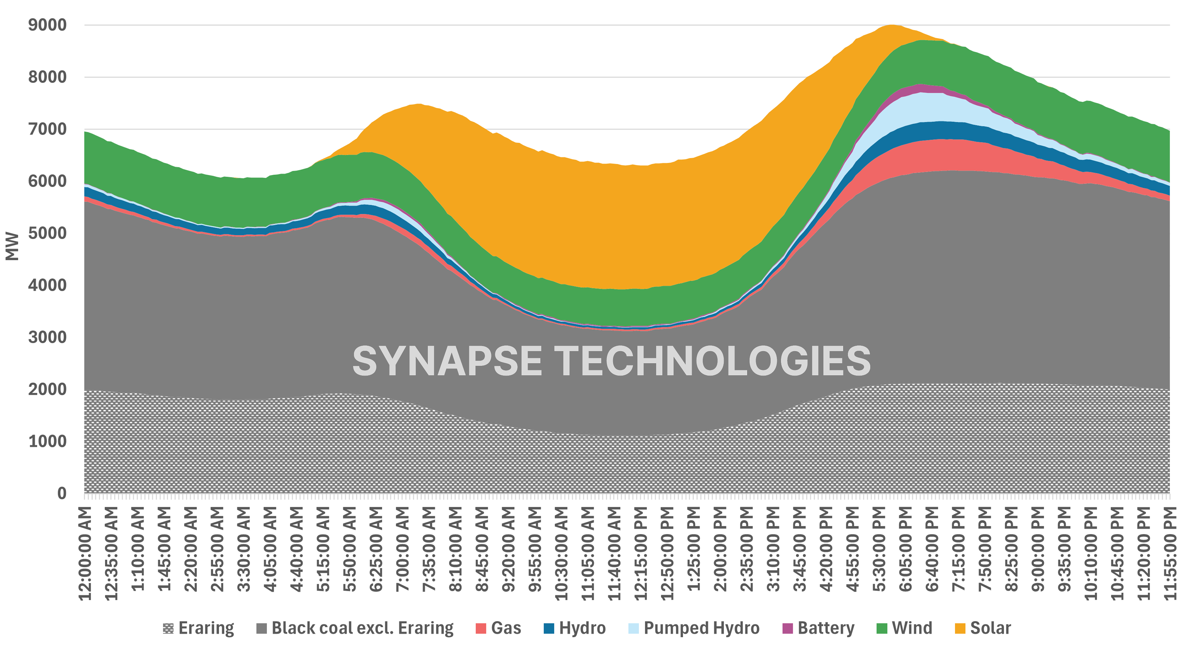 In fact, as seen in Figure 1, had Eraring exited in August 2025 as initially expected, NSW would have had to replace a power station contributing almost as much energy as wind and solar combined over the last year (24% vs 26%), more than both in Q2 (28% vs 20%), and matching them in Q3 (23%). Given its ‘baseload’ profile, Eraring’s output is disproportionately valuable in the evening peak (when solar generation - both grid-scale and rooftop - tapers off, exposing higher net load) especially on low wind days. This point becomes particularly apparent when we take a closer look at the NSW generation mix on a time-of-day basis.