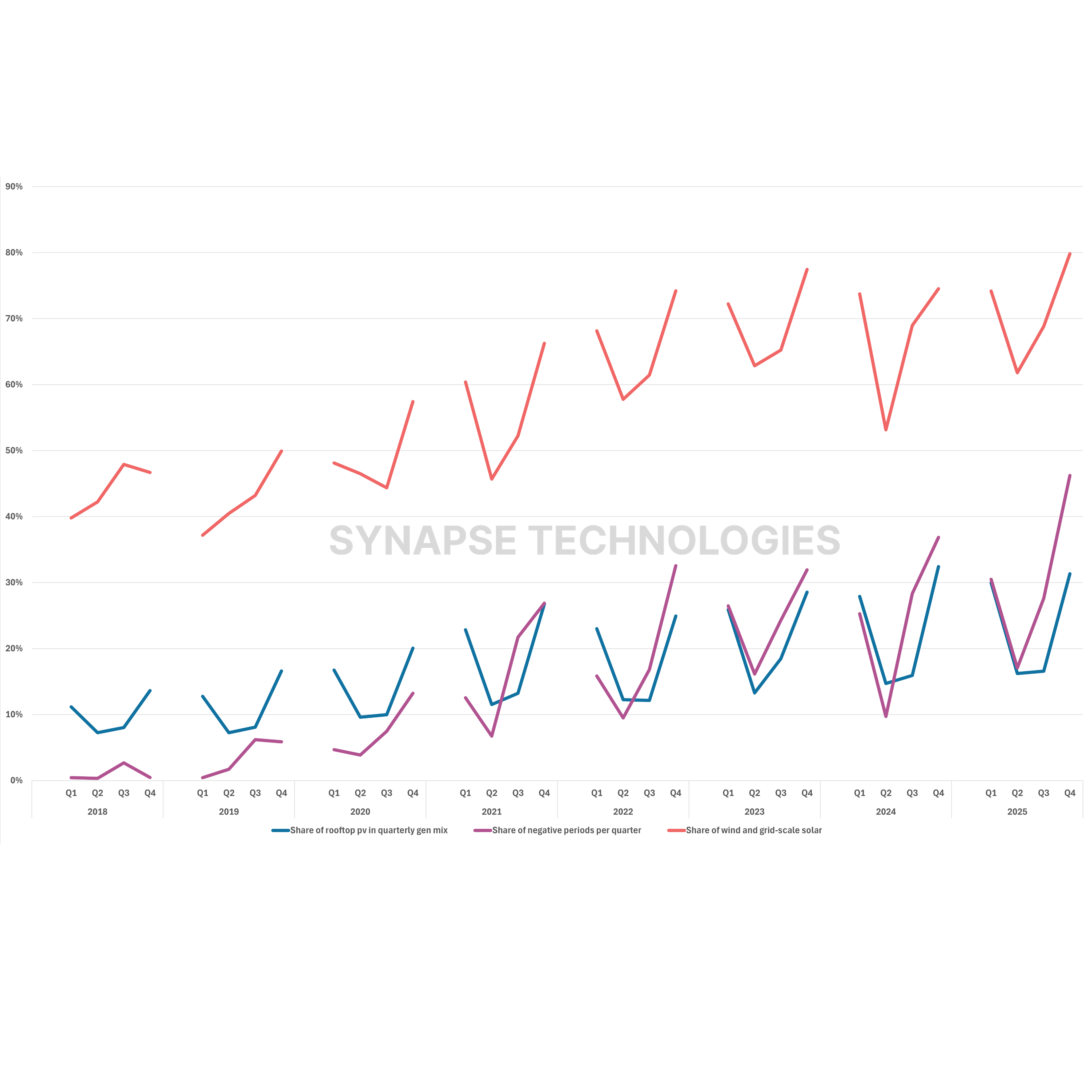 As seen in Figure 2, in 2025, Eraring alone supplied approximately 30% (80% for all coal generators) of the state’s energy outside solar hours (7PM – 5AM), compared to 18% (50% for all coal generators) during the day (9AM – 3PM). This trend suggests that its exit would have almost certainly led to a spike in intraday volatility and a strong bull market for NSW batteries in 2026. Figure 2 also shows that batteries in NSW have room for substantial growth given all remaining coal generators are scheduled to retire by 2040, especially so since their operational profile aligns with the system need for intraday flexibility. In addition to the intraday volatility driven by solar, seasonal volatility trends are also emerging due to irradiation variance. As seen in Figure 1, renewable generation share in winter (Q2) is consistently the lowest across quarters and this seasonal difference is growing. Consequently, coal generators are increasingly having to do more in Q2 compared to other quarters (71% in Q2 vs 61% in Q4, 2025).