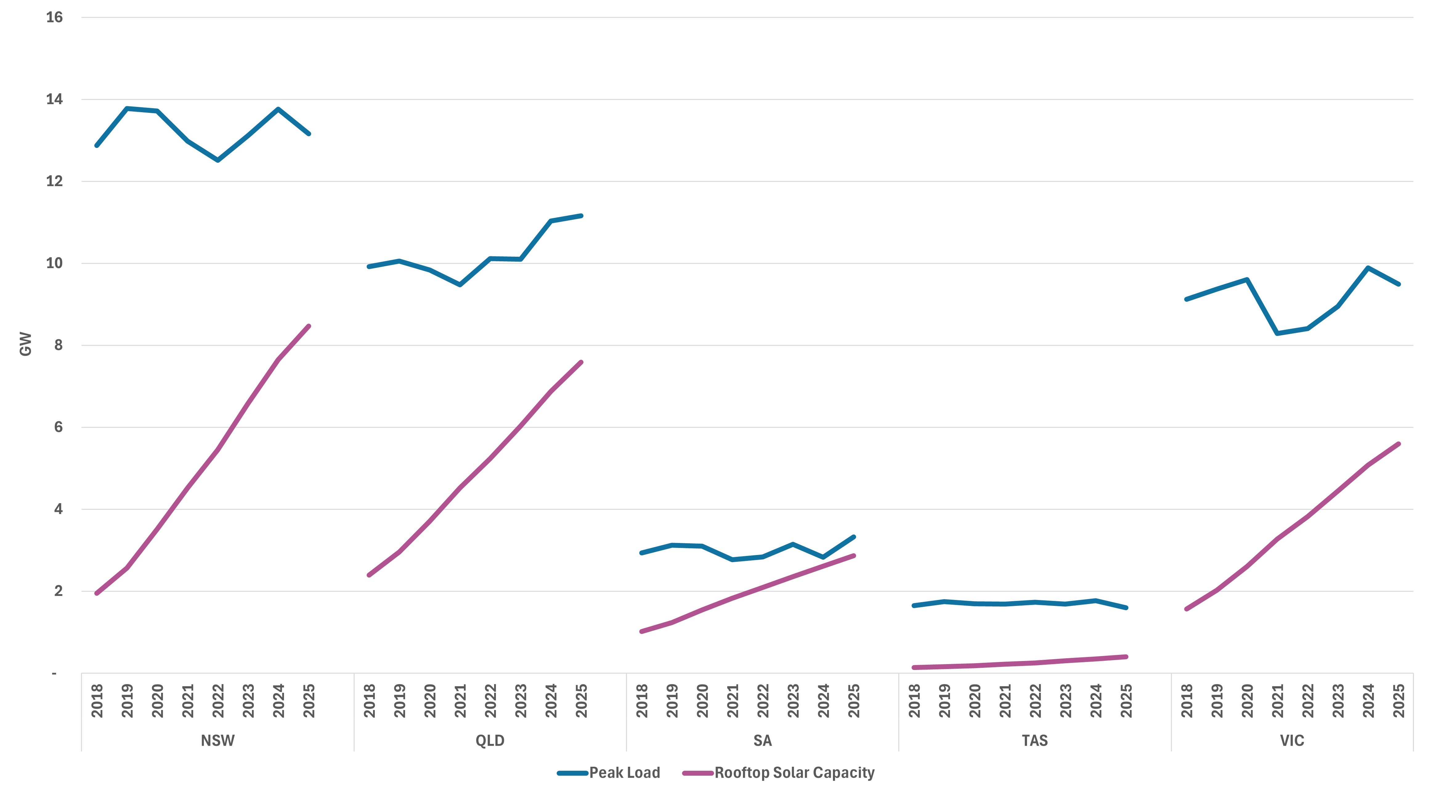 Rooftop solar has more than tripled in the last seven years, growing from approximately 7 GW in 2018 to 25 GW in 2025 across all NEM states. It is the single largest electricity source in Australia by installed capacity, with the nation steadily leading the world in solar per capita. Meanwhile, peak demand in the NEM has remained relatively even, bar a modest jump in Queensland.