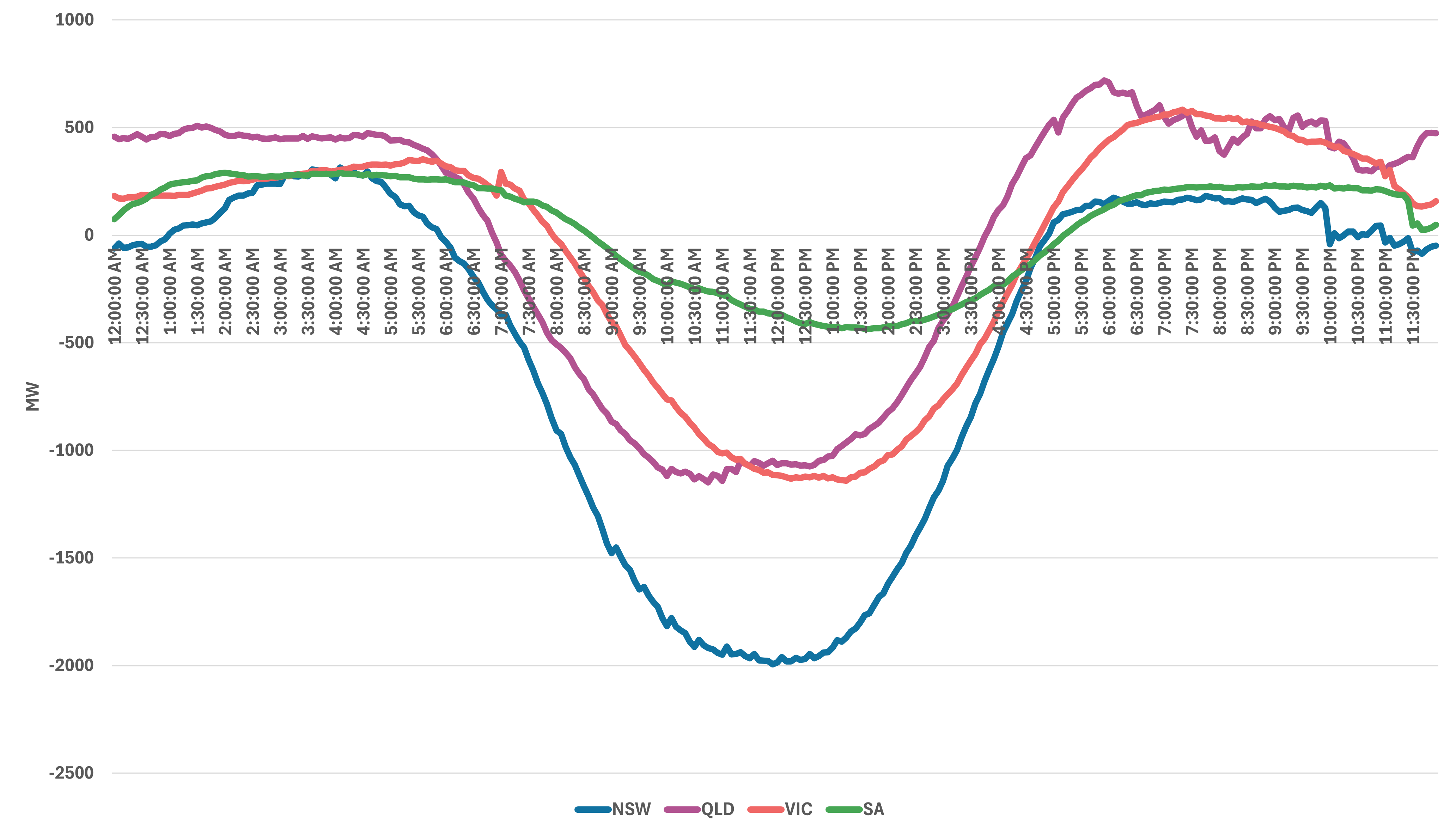 Midday demand has fallen by ~0.3 GW in South Australia and as much as 2 GW in NSW. This energy has not disappeared, it is still being consumed, but it is now generated behind-the-meter and therefore invisible to the market.